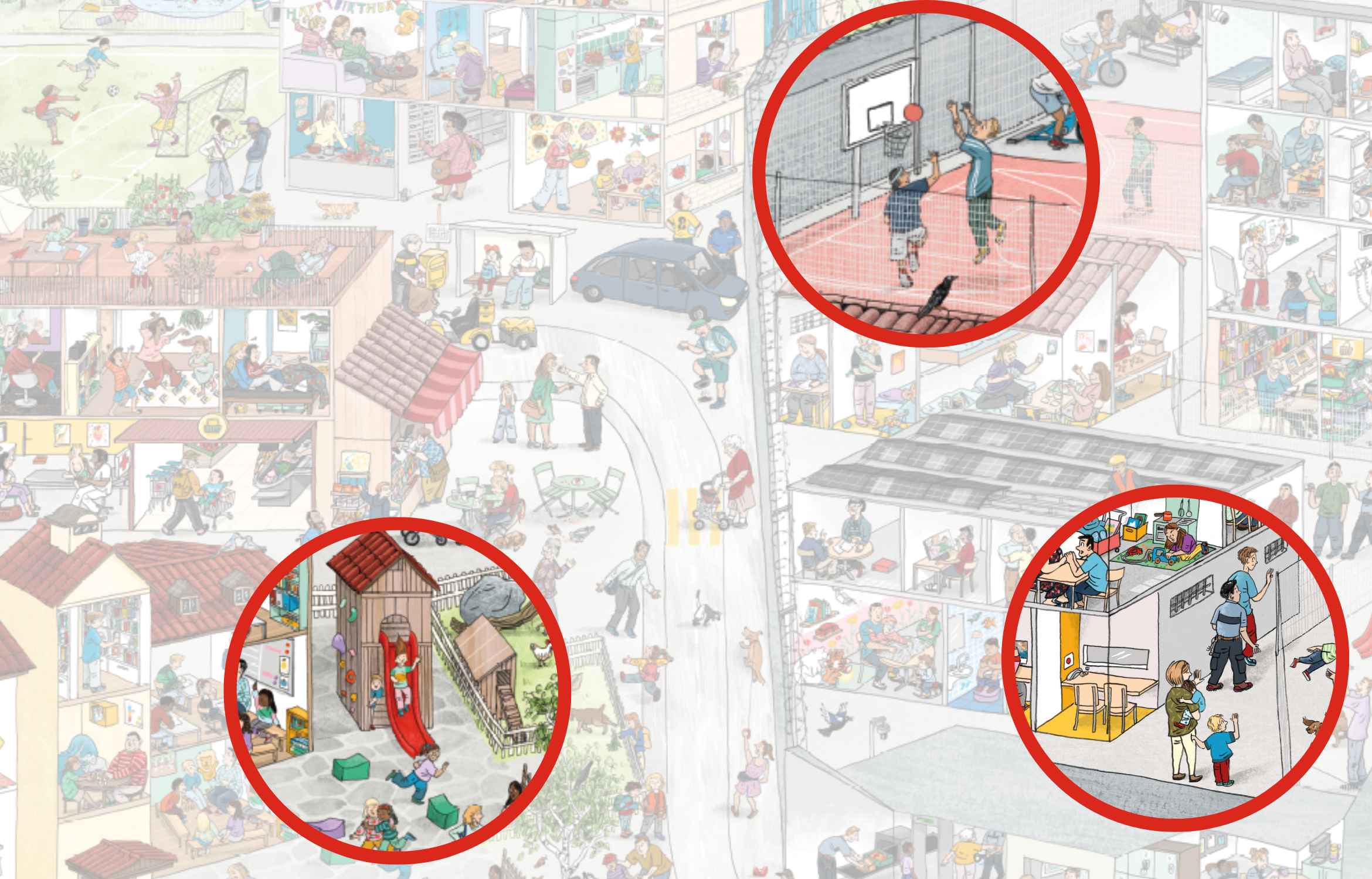 Das Wimmelbild zeigt die Parallelwelten aller Betroffenen. Während der Besuchszeit im Gefängnis schafft es eine kindgerechte Atmosphäre im Hier und Jetzt und bringt Familien über Bilder und Geschichten in einer herausfordernden Lebenssituation spielerisch näher zusammen.