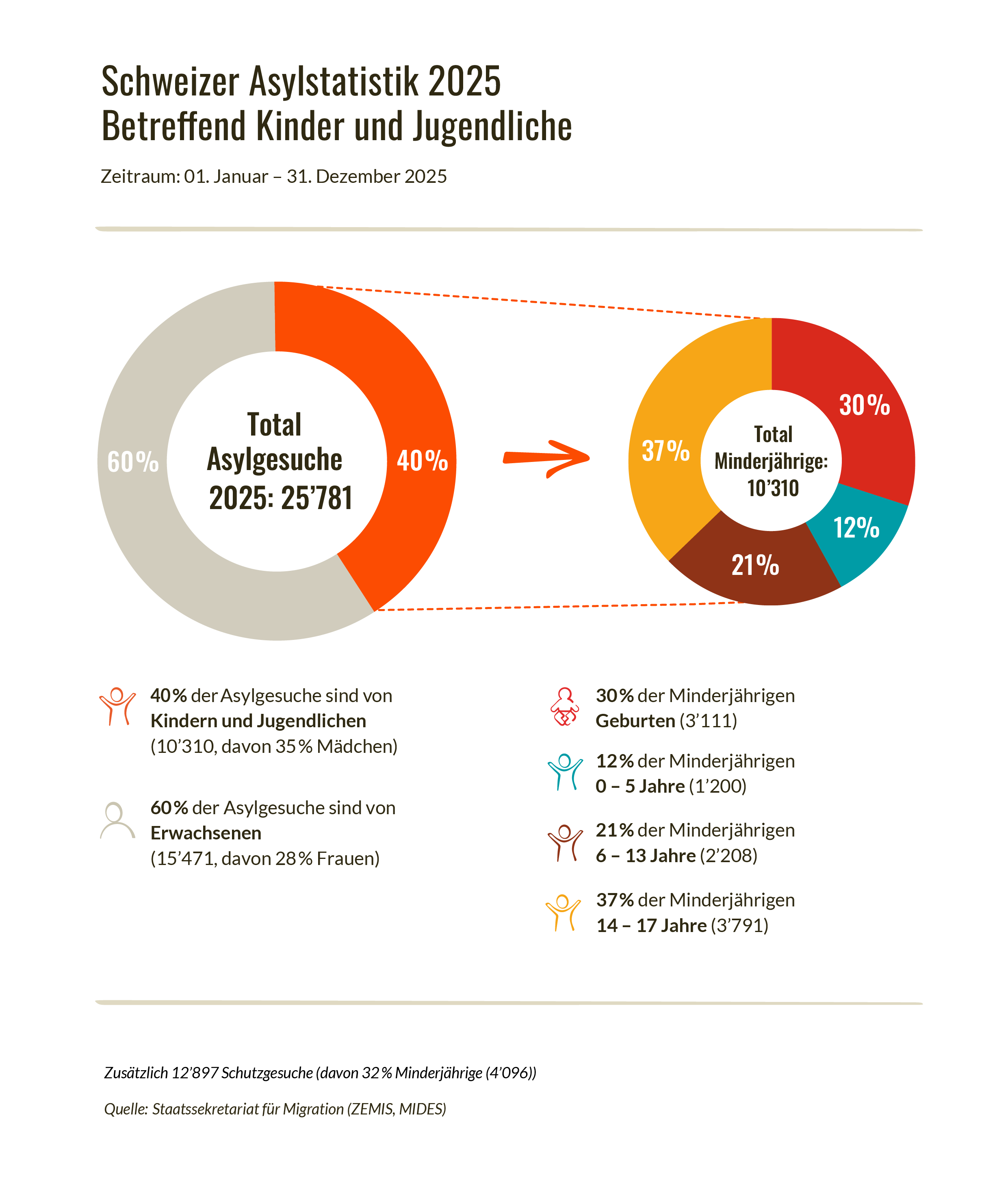 Kürzlich hat das Staatssekretariat für Migration (SEM) die jährliche Asylstatistik publiziert. 2025 ist die Gesamtzahl der neuen Asylgesuche im Vergleich zum Vorjahr weiterhin leicht gesunken. Der Anteil der von Kindern gestellten Gesuche bleibt jedoch mit 40 Prozent nach wie vor sehr hoch, wie unsere Auswertung zeigt.