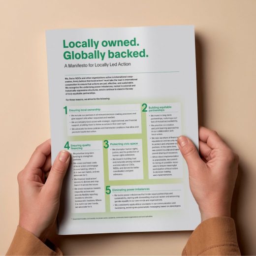 We, Swiss NGOs and other organizations active in international cooperation, firmly believe that local actors must take the lead in international cooperation to ensure that actions are just, effective, and sustainable. For these reasons, we strive for the following: